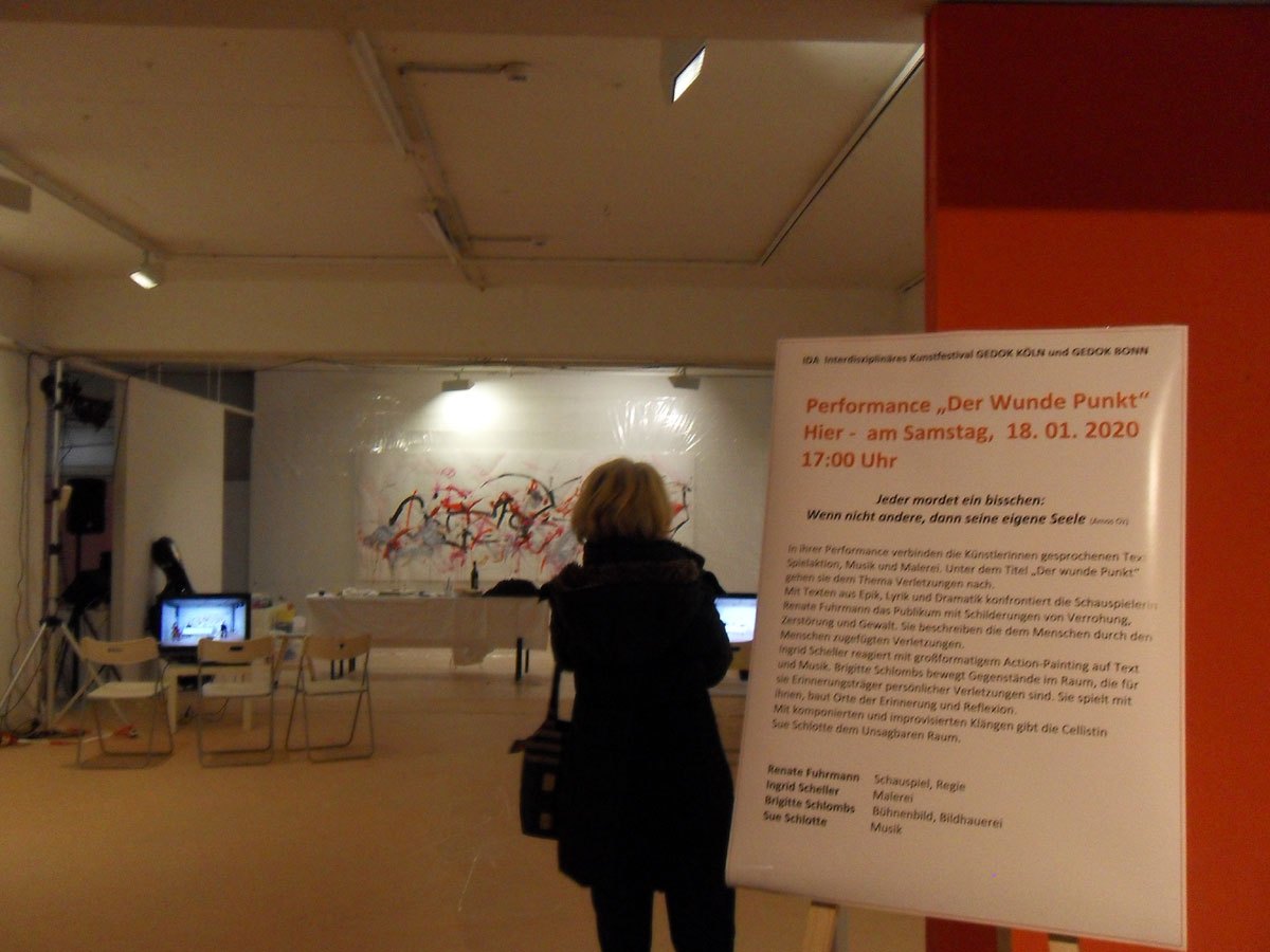 Das 2. InterDisziplinäre Kunstfestival der GEDOK KÖLN und der GEDOK Bonn fand vom 14. bis 19. Januar 2020 im Frauenmuseum Bonn statt. In sieben eigenwilligen Produktionen zeigen die Künstlerinnen überraschende Positinen ihrer interdisziplinären Zusammenarbeit. Zu erleben waren Musik, Live-Painting, Stimm- oder Videokunst in Verbindung mit literarischen Figuren, die ihre ganz eigene Geschichte erzählen.