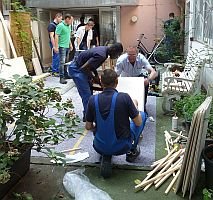 Diese Aktion des FreiwilligenTages fand ab 8.00 Uhr in den Räumen der GEDOK KÖLN statt. Elf Mitarbeiter der Firma Wefers hatten sich eingefunden, um Podeste zu bauen: es wurde gemessen, gesägt, gehämmert und gestrichen. Und zwischendurch versorgte die GEDOK (in Person von Barbara Riege und Christel Tomson) die fleißigen Helfer mit Essen und Trinken.